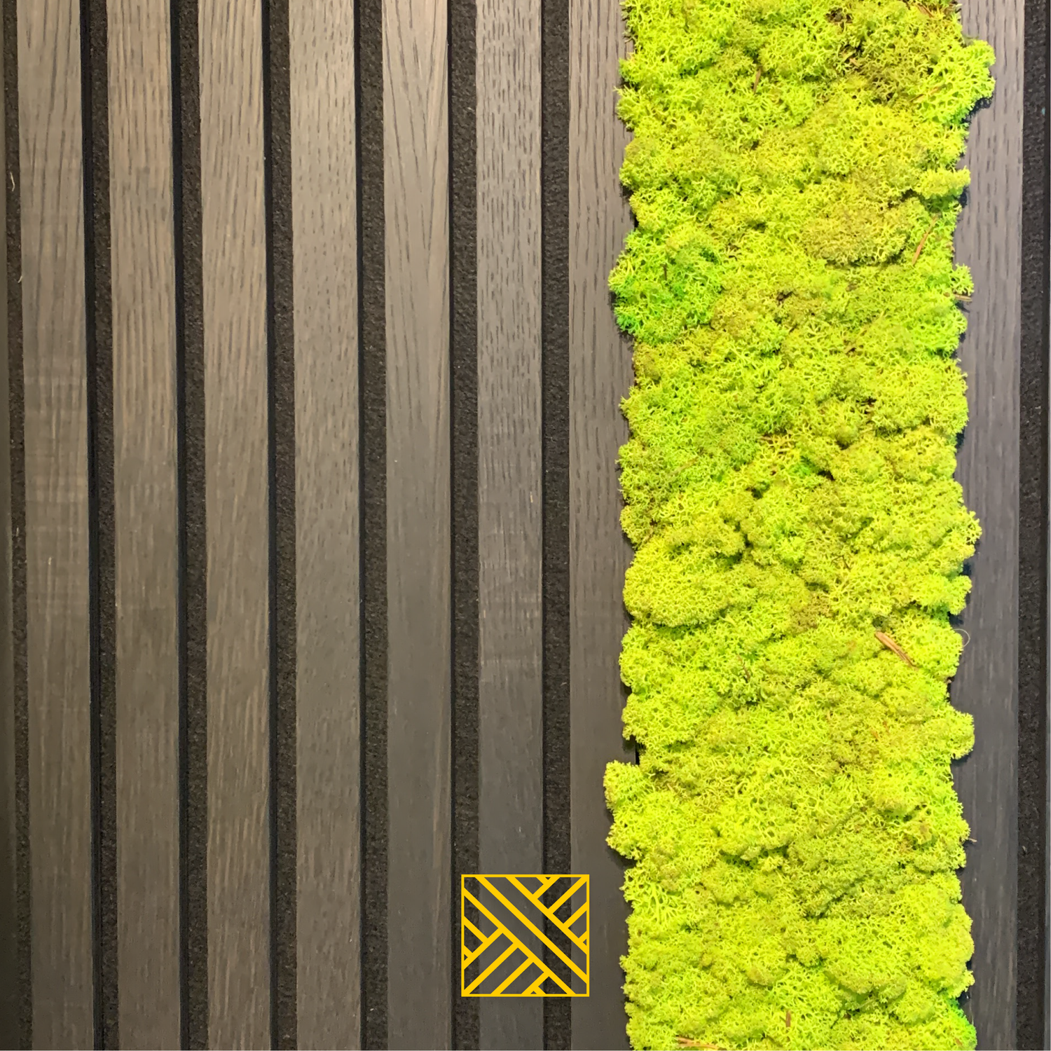 Le panneau de bardage intérieur CHARLI de JUTO allie esthétisme urbain et connexion avec la nature. Ses lattes teintées en noir charbon ajoutent une touche d'élégance et de modernité à votre intérieur. Mais ce qui rend ce panneau vraiment unique, c'est l'insertion d'une bande de lichen stabilisé qui apporte une touche verdoyante et apaisante.