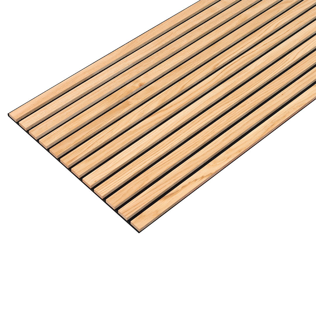 Matériaux : feutrine acoustique majoritairement composée de plastiques recyclés présente pour capturer les ondes sonores afin de créer une atmosphère calfeutrée. Lattes en mdf clair surfacées par du véritable chêne naturel verni pour garantir une longévité sans précédent.