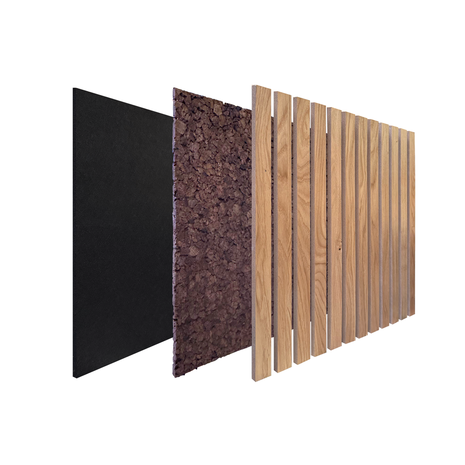 Matériaux : feutrine acoustique majoritairement composée de plastiques recyclés présente pour capturer les ondes sonores. Sur cette feutrine, une couche de liège expansé est fixée afin d'optimiser l'isolation offerte par le panneau. Lattes en multiplex peuplier surfacées par du véritable chêne naturel verni pour garantir une longévité sans précédent.